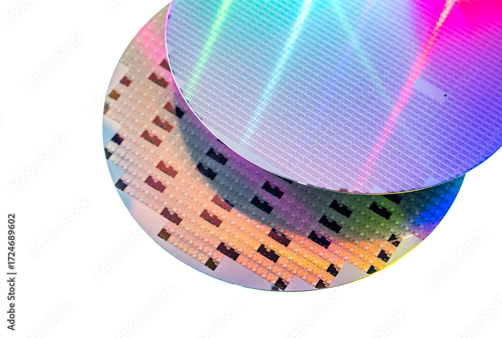 Naklejka na ściany i meble - Polycrystalline silicon wafer with microchips isolated on white. Microelectronic device for the fabrication of integrated circuits..