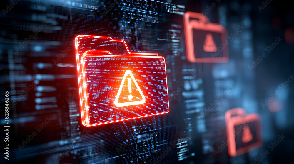 Naklejka na ściany i meble - Cybersecurity file breach concept. Digital document and folder warning alert with error, malware attack, data corruption, and information loss through system vulnerability. .