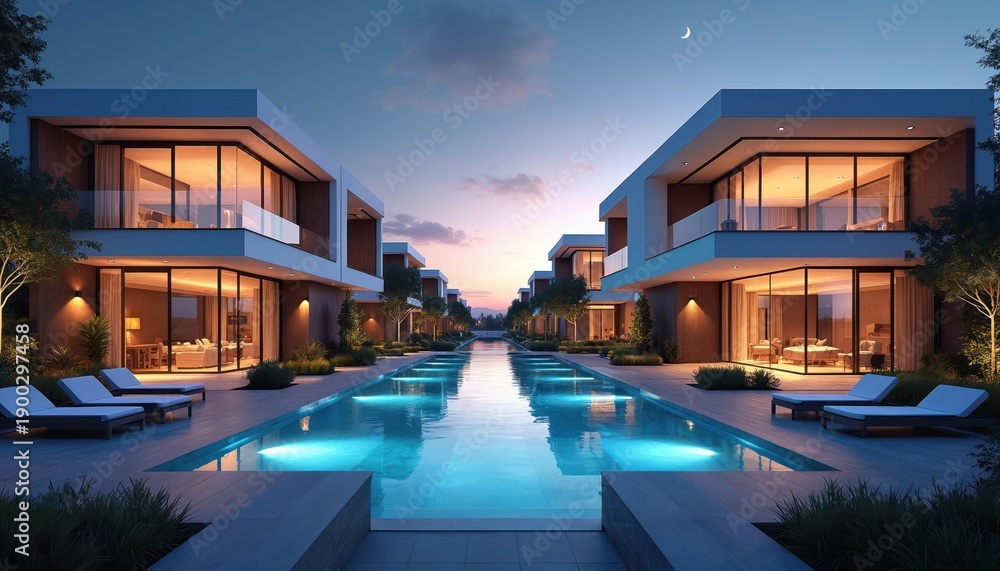 Naklejka na ściany i meble - Modern villas with infinity pool at dusk. Luxury homes feature large windows, elegant lighting, and lounge chairs. Perfect for resort living or upscale real estate..
