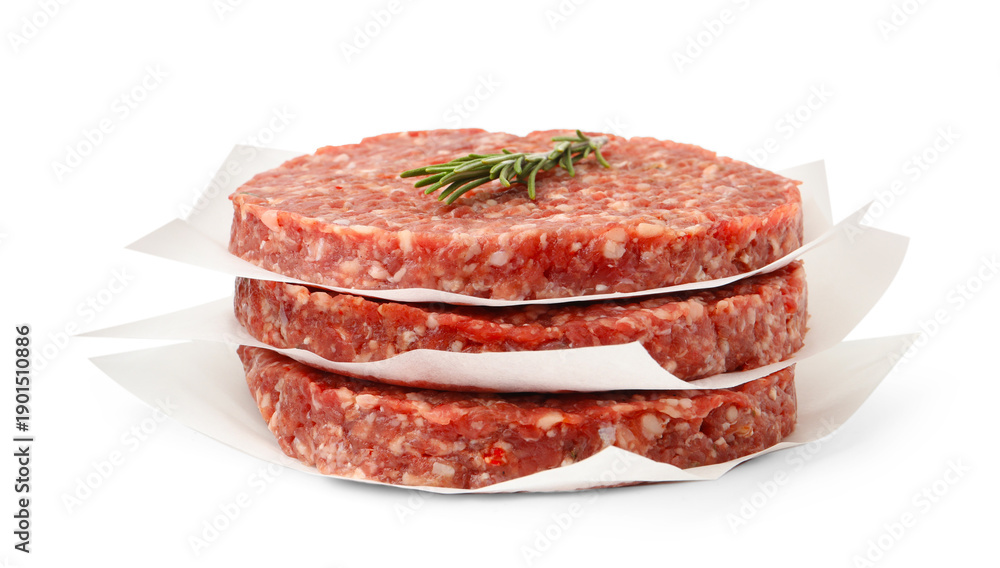 Naklejka na ściany i meble - Uncooked meat patties with rosemary isolated on white.