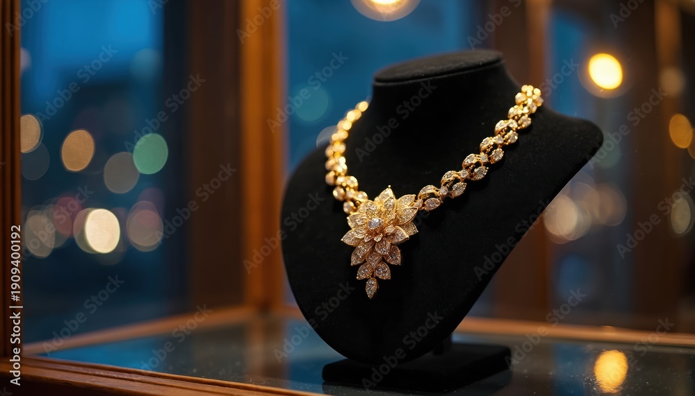 Naklejka na ściany i meble - Gold necklace with diamonds displayed on black stand inside shop. Expensive jewelry accessory shines with gems and ornate design. Luxury item in store window..