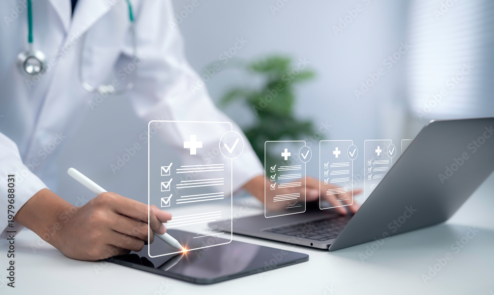 Naklejka na ściany i meble - Doctor using tablet with digital medical checklist interface healthcare documentation patient record management clinical workflow quality control smart healthcare system concept.