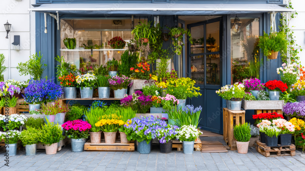 Naklejka na ściany i meble - Flower shop facade displaying colorful potted plants and blooming flowers outside on a charming urban sidewalk.