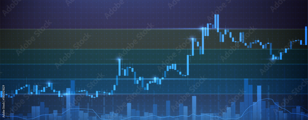 Naklejka na ściany i meble - Financial market chart, stock price movements with blue candlestick graphs, trading data analysis, and economic growth indicators on digital screen, abstract vector background.