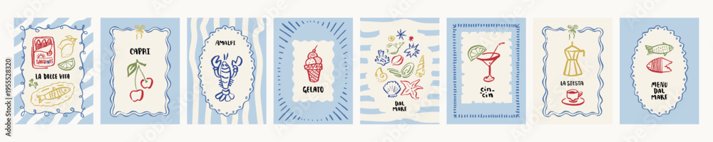 >Naklejki na ściany i meble>Wybrane motywy - zobacz więcej !>Lew>Italian summer vacation prints in sea blue colors. Amalfi coast poster wall art. Coastal Italy poster set. Vintage vector food illustrations. Naive sardines, lobster, seafood icons doodle sketches