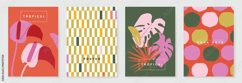 Naklejka na ściany i meble - Summer tropical poster set vector. Retro botanical monstera and palm leaf wall art with abstract fan pattern and geometric checker background in coral, pink, green, cream and mustard for home decor..