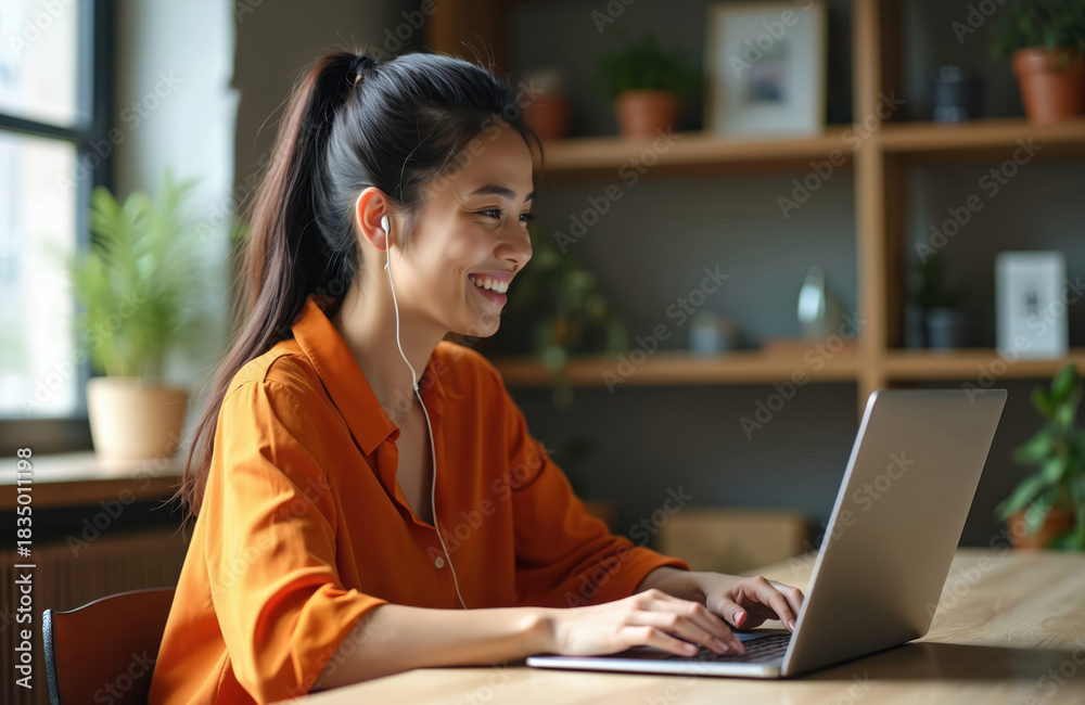>Naklejki na ściany i meble>Wybrane motywy - zobacz więcej !>Liście>Smiling woman uses laptop for online meeting. Girl wears earphones and orange shirt. Happy person sits at wooden table at home office room, works using computer. Video communication concept.