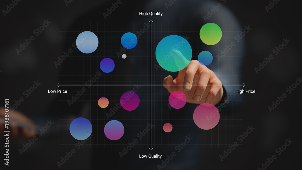 Naklejka na ściany i meble - Marketing Positioning Strategy and Perceptual Map Concept. Market Segmentation, Competitive Advantage, Brand Differentiation. Businessman Analyzing Target Audience. 3D Illustration.