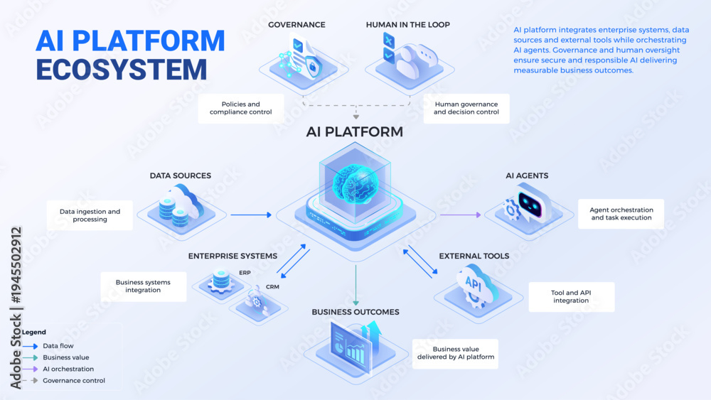 Naklejka na ściany i meble - AI Platform Ecosystem Diagram - isometric infographics technology vector - AI platforms connect data, enterprise systems, AI agents, external tools under human governance delivering business value.