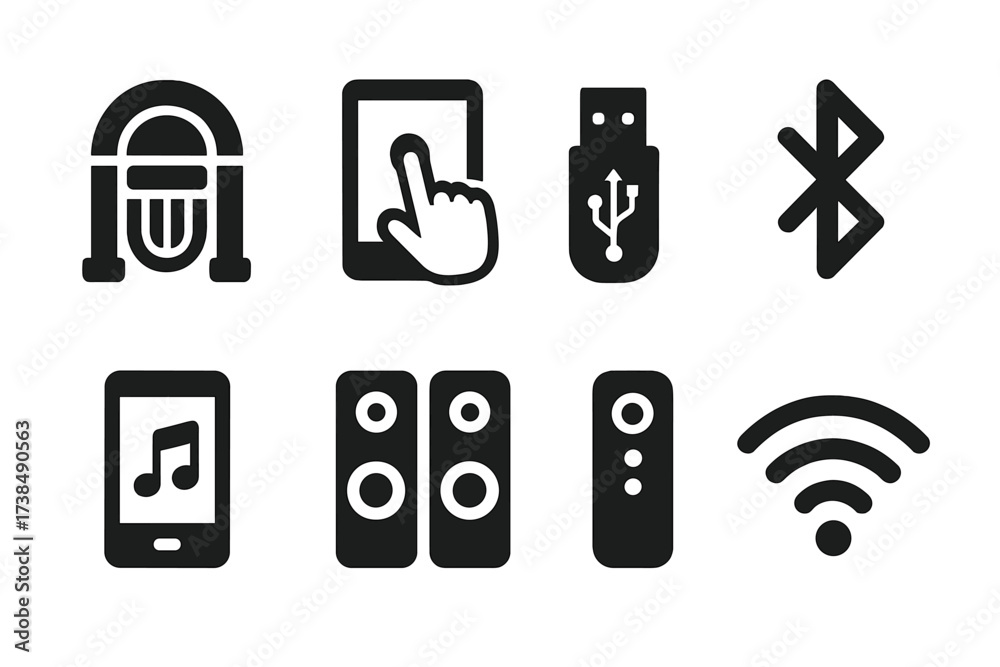 Naklejka na ściany i meble - Jukebox Tech Icon Set. Solid, filled icon set of jukebox technology evolution: digital screen, touchscreen interface, USB input, Bluetooth symbol, app control,.
