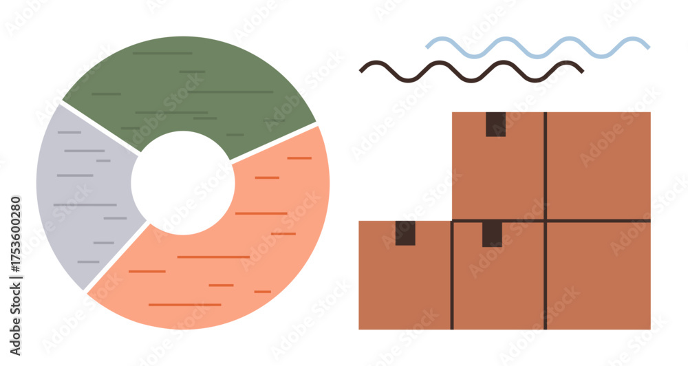 Naklejka na ściany i meble - Multicolor segmented pie chart paired with stacked brown boxes and abstract wavy lines. Ideal for logistics, data analysis, business planning, inventory, organization, process flow, and teamwork.