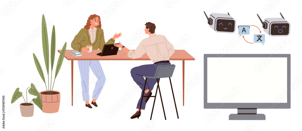 >Naklejki na ściany i meble>Wybrane motywy - zobacz więcej !>Londyn>Two colleagues discuss AI-powered language translation as robot icons highlight speech processing. Ideal for technology, language learning, teamwork, innovation, digital interaction, workplace