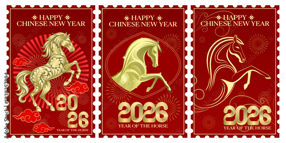 Naklejka na ściany i meble - Golden horse illustration for 2026 chinese new year celebration on red background symbolizing strength and prosperity, vector eps.
