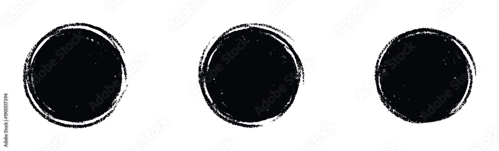 Naklejka na ściany i meble - Black grunge circles with a textured distressed effect provide versatile graphic resources for modern branding, emblems, seals, labels, and symbolic marks in various visual projects..