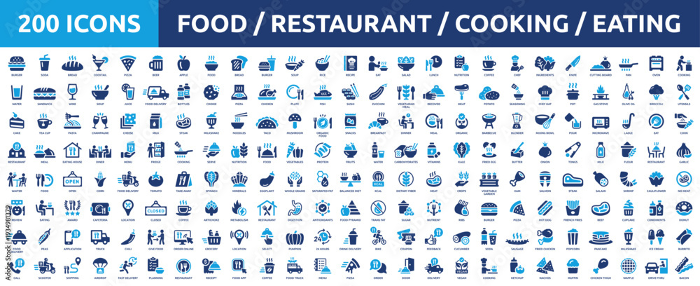 Naklejka na ściany i meble - Huge set of 200 solid icons. Mega collection concept of food, restaurant, kitchen, cooking and eating. Vector illustration..