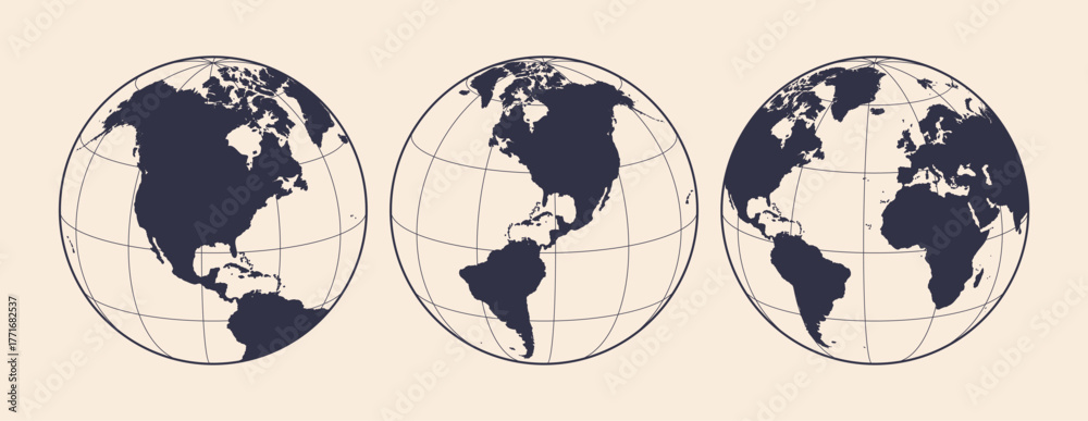Naklejka na ściany i meble - Globe, map, North South America. Earth globe with United States of America, USA. Europe, Asia, America, Oceania globe set. Map of America, USA Earth globe sign, symbol, circle. Vector Illustration.