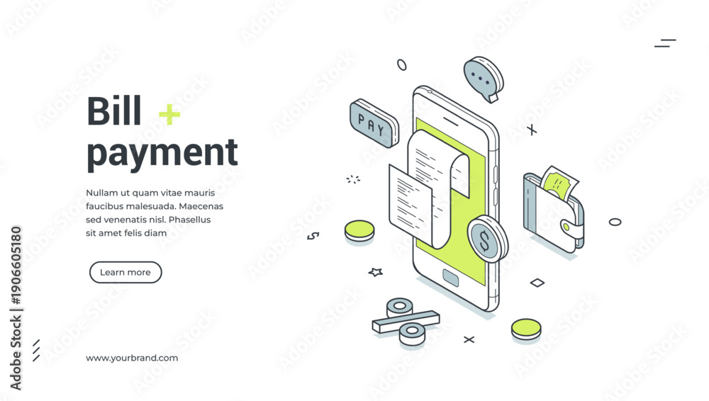 Naklejka na ściany i meble - Bill payment web banner. Isometric template for a landing page on online finance and e-payment. Vector illustration with smartphone, wallet, receipt for financial transactions and banking service.