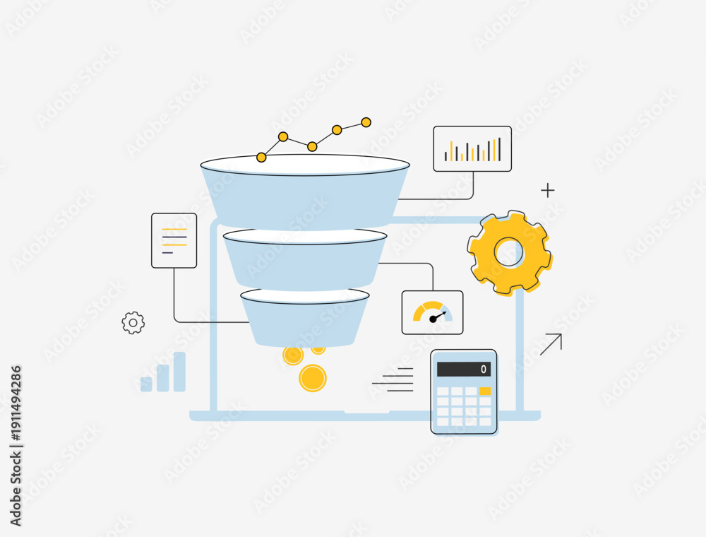 Naklejka na ściany i meble - Marketing funnel analytics, sales conversion process with data filtering and business metrics, e-commerce digital optimization workflow and KPI charts, modern flat infographic vector illustration.