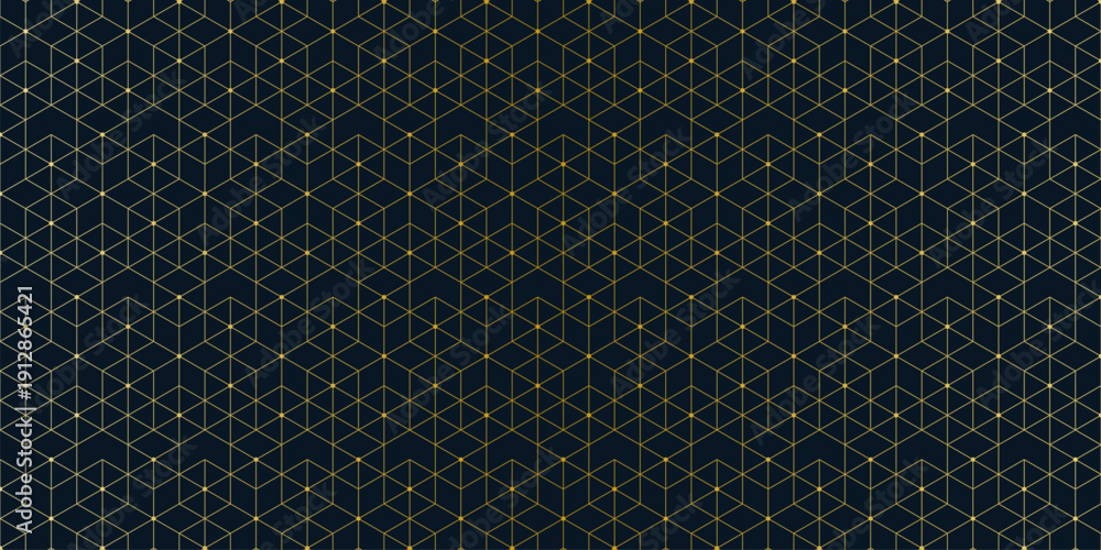 Naklejka na ściany i meble - Elegant geometric gold pattern with hexagonal and triangular lines and dots on dark background.