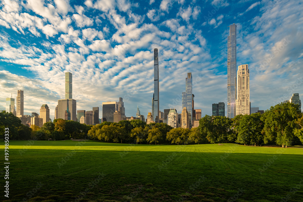 Naklejka na ściany i meble - Lush green grass and trees provide a natural foreground to the skyline of Midtown Manhattan from Central Park with the tall and thin ultra luxury skyscrapers of Billionaires Row in New York City..