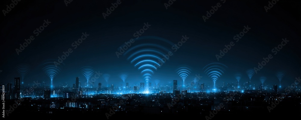 Naklejka na ściany i meble - Smart city night skyline with glowing wifi signals, wireless network coverage and digital connectivity concept.
