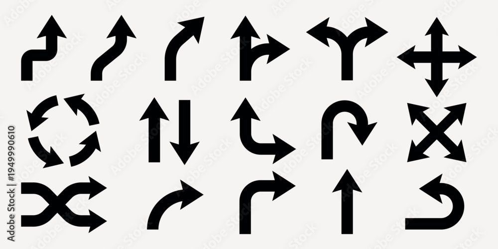 Naklejka na ściany i meble - Collection of various black directional arrows on a light background, featuring straight, curved, and intersecting arrows in different orientations. Element vector set..