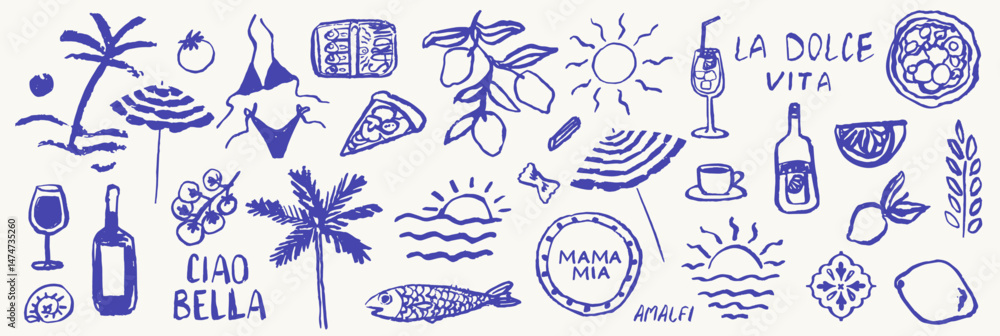 Naklejka na ściany i meble - Italian or greek style vacation hand drawn vector illustrations in grunge chalk or charcoal rough doodle sketch style elements. Summer vacation in ink simple style. Drawings for poster, placard print..