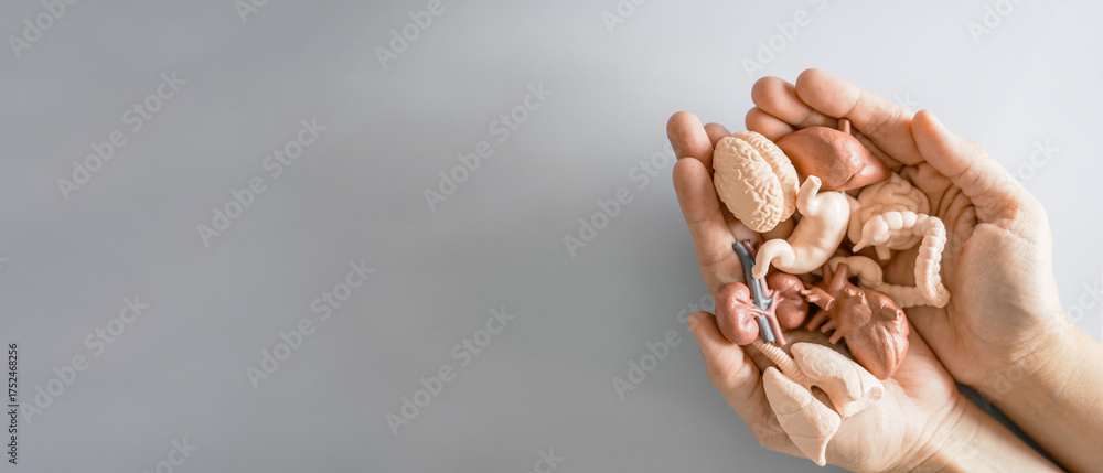 Naklejka na ściany i meble - Hands holding mini internal organs, health insurance, world organ donation day, wellness concept .