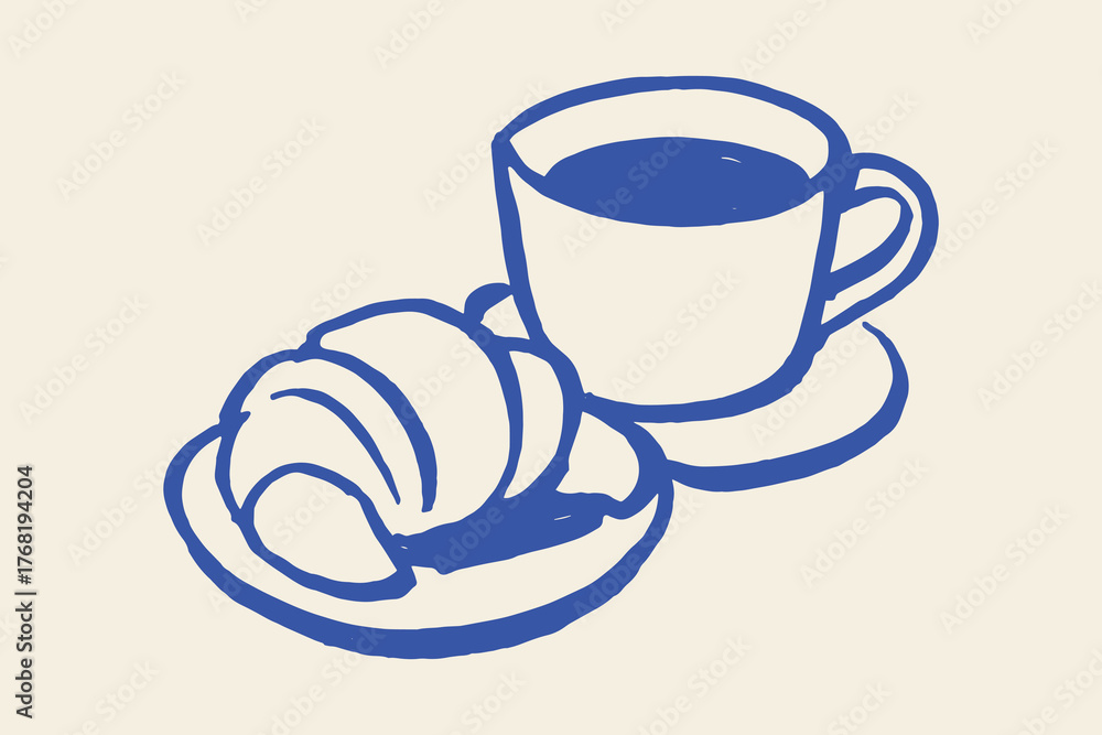 Naklejka na ściany i meble - coffee cup croissant breakfast sketch blue brush line vector illustration.