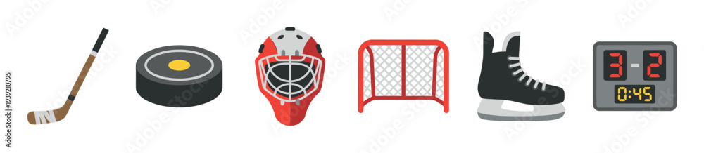 Naklejka na ściany i meble - Ice hockey equipment and gear icon set with a player stick, puck, goaltender mask, goal net, skate, and a game scoreboard in a simple flat graphic illustration style.