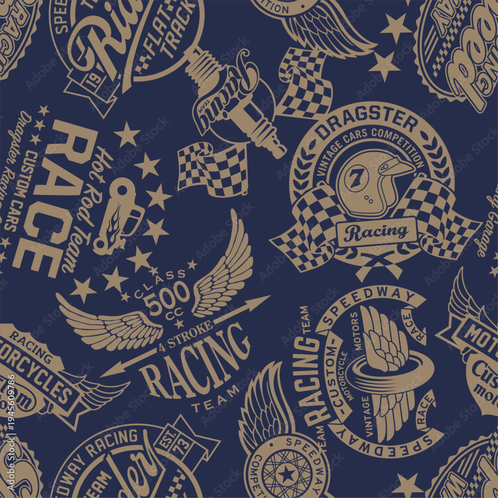 Naklejka na ściany i meble - Speedway racing team labels badges patchwork wallpaper vintage vector seamless pattern for boy man sportswear t shirt fabric sweatshirt .