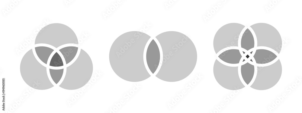 >Naklejki na ściany i meble>Wybrane motywy - zobacz więcej !>Mosty>Set of gray colored Venn diagrams with 2, 3 and 4 intersected circles isolated on white background. Templates for statistics chart, presentation or analytics schema. Vecor graphic illustration