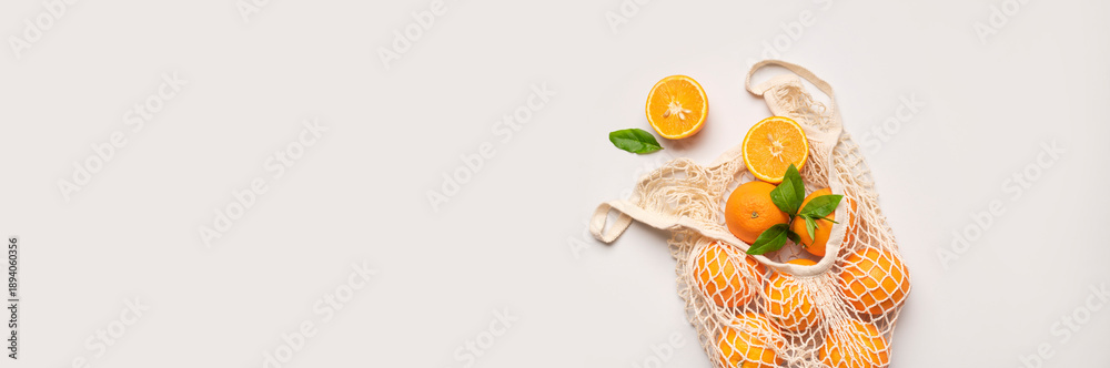 Naklejka na ściany i meble - Mesh string bag with ripe oranges on gray background flat lay top view. Concept of reusable bag for shopping, goods, and eco-friendly living. Zero waste. Background with citrus fruits.