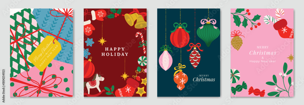 Naklejka na ściany i meble - Christmas and Happy New Year greeting card vector set — colorful ornaments, berries and festive decorations with playful layout, festive theme for cards, posters and packaging..
