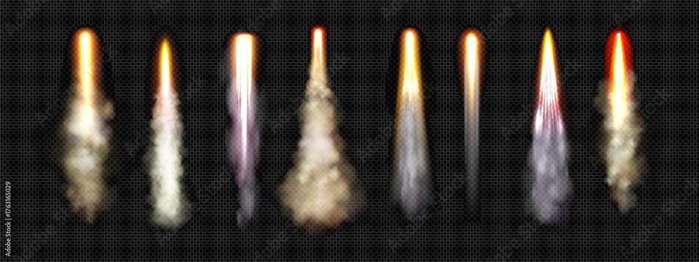 Naklejka na ściany i meble - Glowing rocket flames with fire trails and jet exhaust streams for spaceship launch or propulsion effect. Orange plasma thrust with smoke plumes and bright energy beams. Spacecraft engine elements..