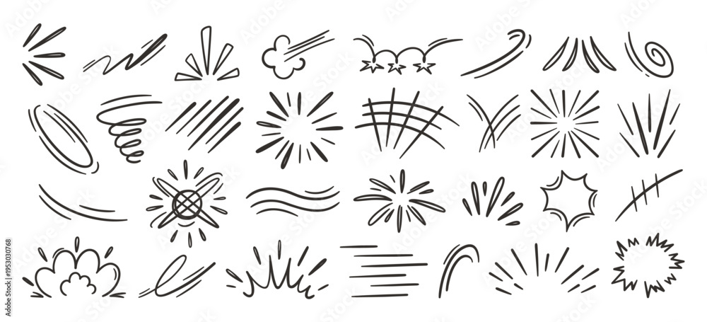 Naklejka na ściany i meble - Comic anime motion with movement manga doodle and elements speed lines. Burst starburst sparkle with swoosh whoosh impact and zap boom explosion. Smoke cloud comic with curve emphasis movement..