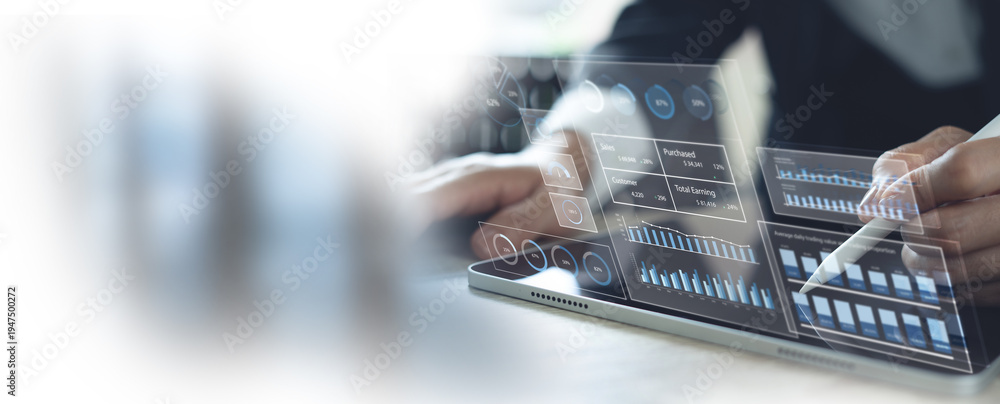 Naklejka na ściany i meble - Business analysis, finance analyst analyzing sales data and financial growth graph chart report. .