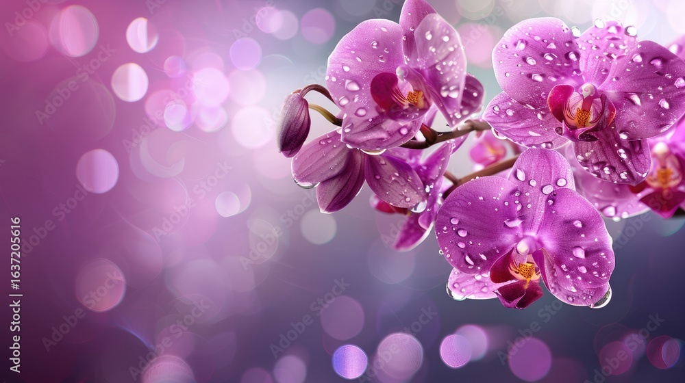 Naklejka na ściany i meble - Close-up of pink orchids with water droplets.