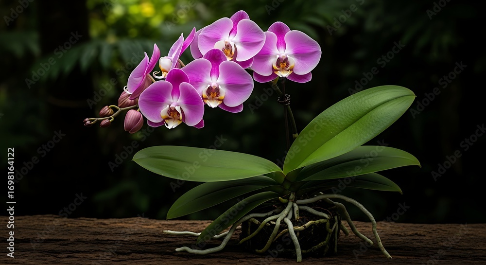 Naklejka na ściany i meble - Vibrant pink orchid blooms with exposed roots on wooden surface.