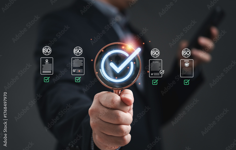 Naklejka na ściany i meble - Quality and approve concept showing a businessman holding magnifying glass with check mark representing certification standard control assurance validation and business reliability in modern industry.