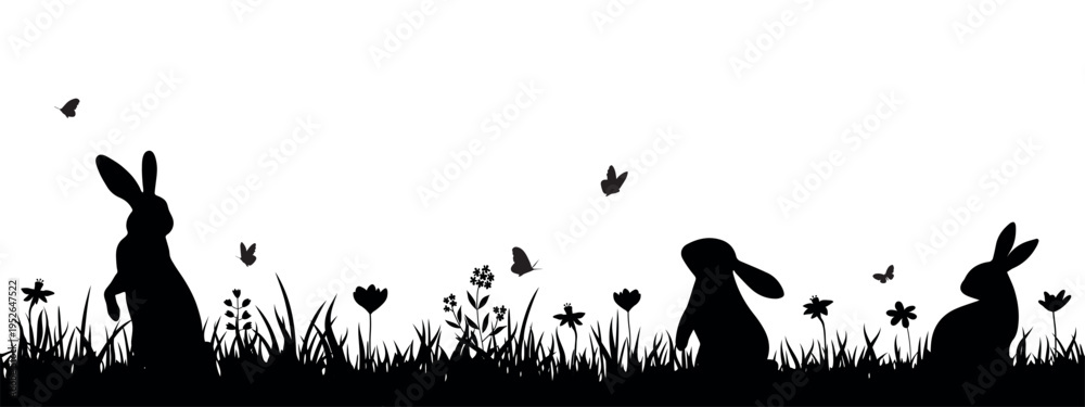 Naklejka na ściany i meble - Easter bunny silhouette border with rabbits in grass, wildflowers and butterflies in spring meadow, decorative horizontal nature background for greeting cards, holiday design and seasonal banners.