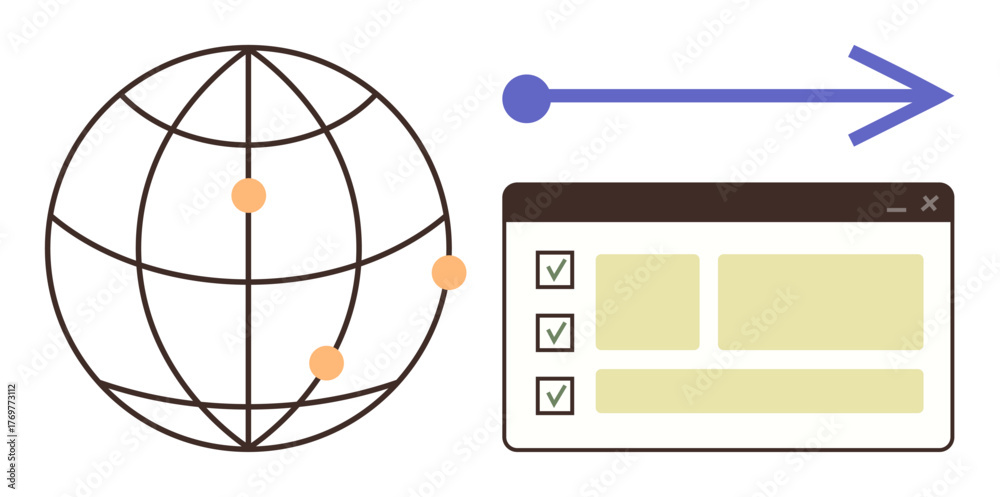 Naklejka na ściany i meble - Globe with connection points, arrow indicating movement toward browser window with checklist. Ideal for data exchange, global communication, workflow, logistics, web development, organization.