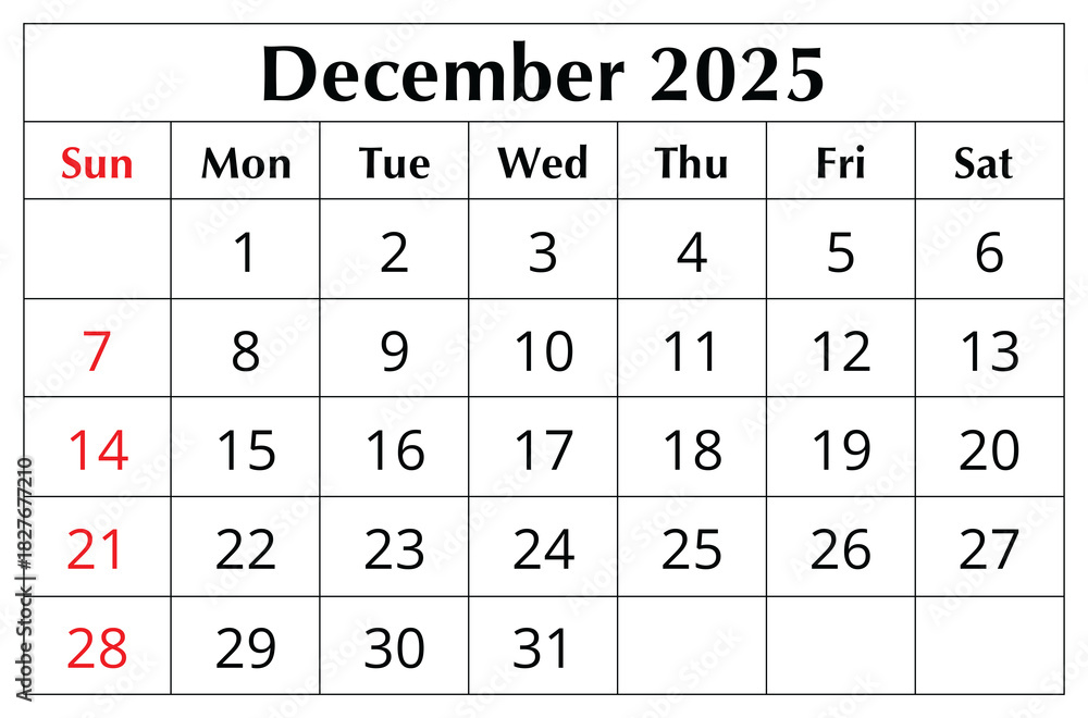Naklejka na ściany i meble - December 2025 ENGLISH month calendar. png transparent illustration.
