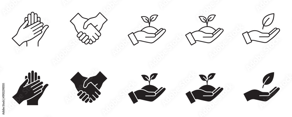 Naklejka na ściany i meble - Set of hand gesture icons for environmental care, sustainability, and partnership, shown in minimalist black outline and solid glyph styles for various design concepts.