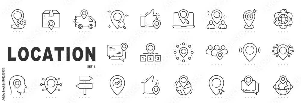 Naklejka na ściany i meble - Outline location icon set featuring map pins, navigation, GPS tracking, destinations, global geography symbols, editable stroke, minimal modern line design..