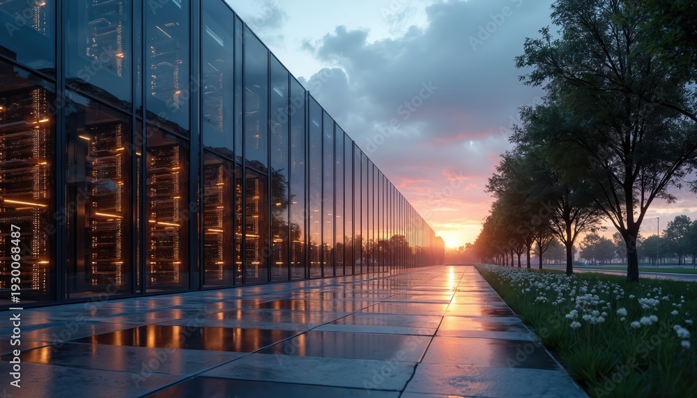 Naklejka na ściany i meble - Modern glass building facade with glowing server racks inside. Exterior view of data center at sunset with paved walkway and green lawn. Tech infrastructure with lights reflecting on wet pavement..