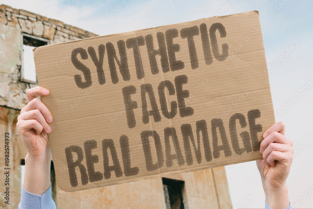 Naklejka na ściany i meble - "Synthetic Face Real Damage" AI-generated replicas of real people cause genuine reputational and psychological harm to individuals. DEEPFAKE. AI. FAKE. HARM. IDENTITY..