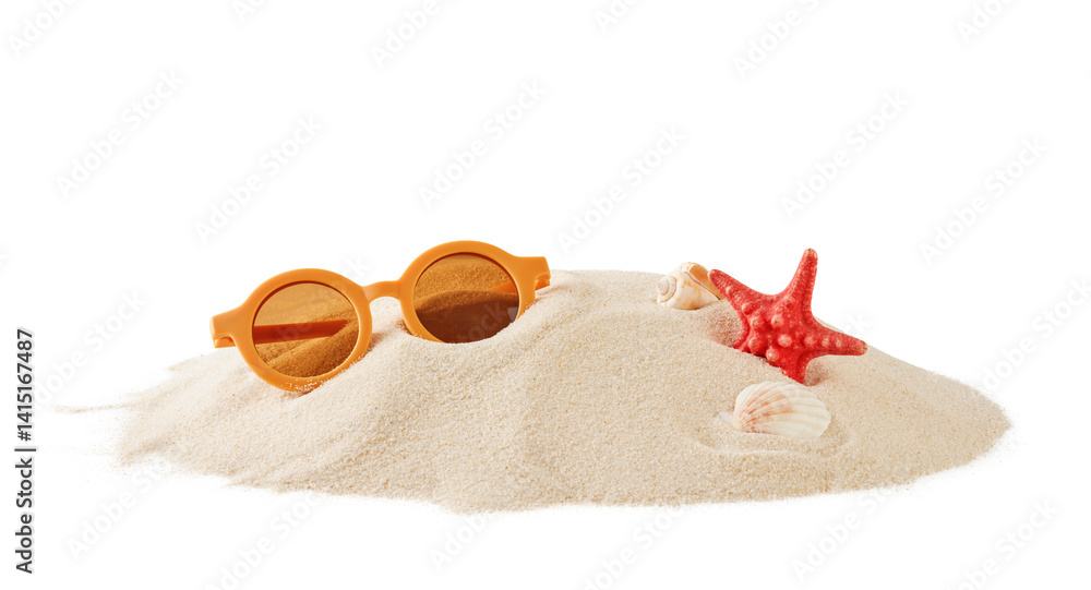 >Naklejki na ściany i meble>Wybrane motywy - zobacz więcej !>Piasek>Beach sand with natural wave pattern, sunglasses, sea shells and stars on white isolated background with clipping path. Summer background. Tourism, vacation and holidays concept. Design Element.