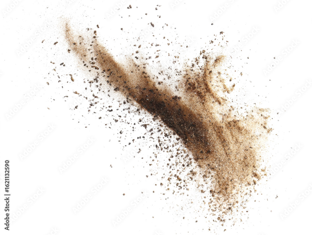 Naklejka na ściany i meble - Sand flying explosion, Golden sand wave explode. Abstract sands cloud fly. Yellow colored sand splash throwing in Air. White background Isolated high speed shutter, throwing freeze stop motion, png.