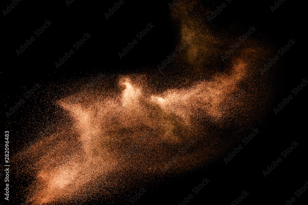 Naklejka na ściany i meble - Abstract sand cloud.Brown sand splash against dark background. Brown dust explosion..
